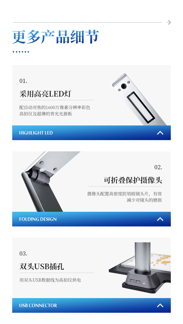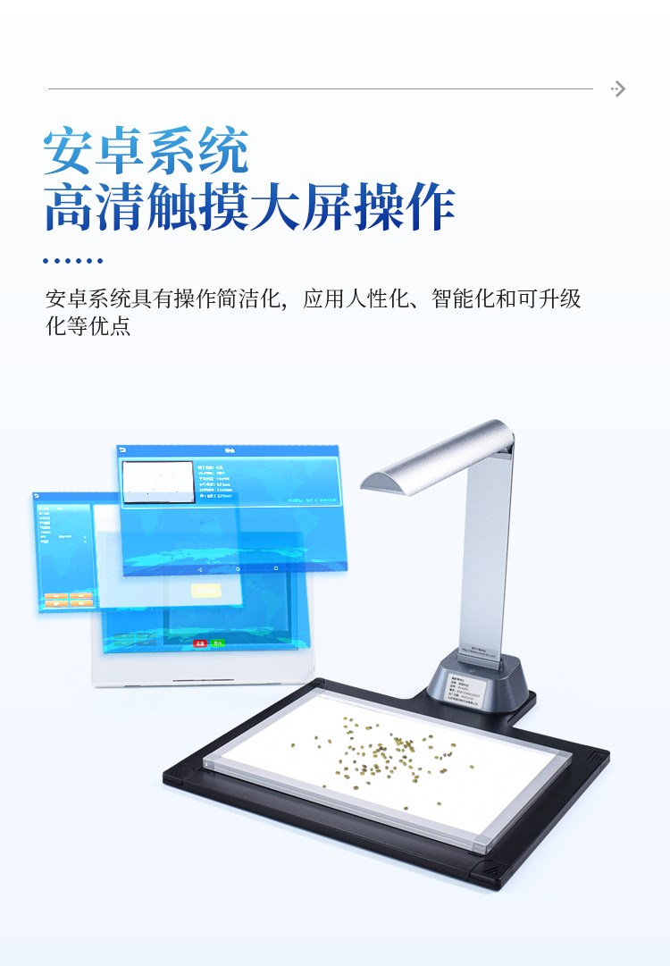 智能考种系统由1600万高拍仪和背光装置组成。背光装置采用的是高亮LED灯,外边框使用铝合金材质制成。软件采用先进的图像处理技术,根据距离变换原理、形态学、凸包检测等技术综合设计的一款嵌入式软件。该设备主要应用在农业领域的田间作物测产及考种等方面,通过高拍仪拍摄的照片,软件自动计算种子数量,种子的面积、周长、长度、宽度、长宽比等数据,根据天平所得的重量与种子的数量自动计算出千粒重;以列表和图形的方式输出结果,便于用户查看与分析研究。本产品也可以手动对作物种子数量修正以确保计数精度、对数据进行保存,并且可以查看数据报表,最后可以将数据以Excel格式导出。