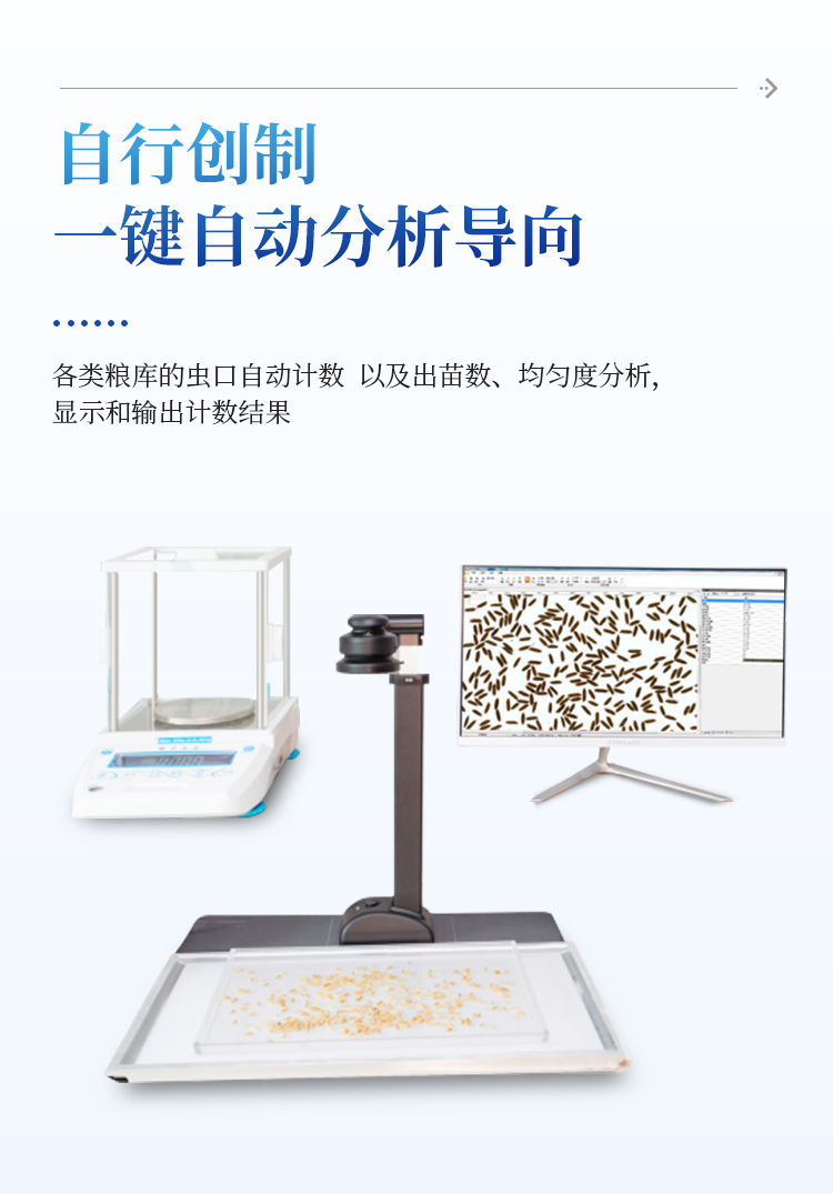 智能考种系统可以测量各种表面光滑的籽粒的数量、千/百粒重与平均粒型(包括长、宽、长宽比、周长、面积),利用图像ORC 识别技术、图像定位、空间转换等技术实现快速识别种子数量及作物性状指标。