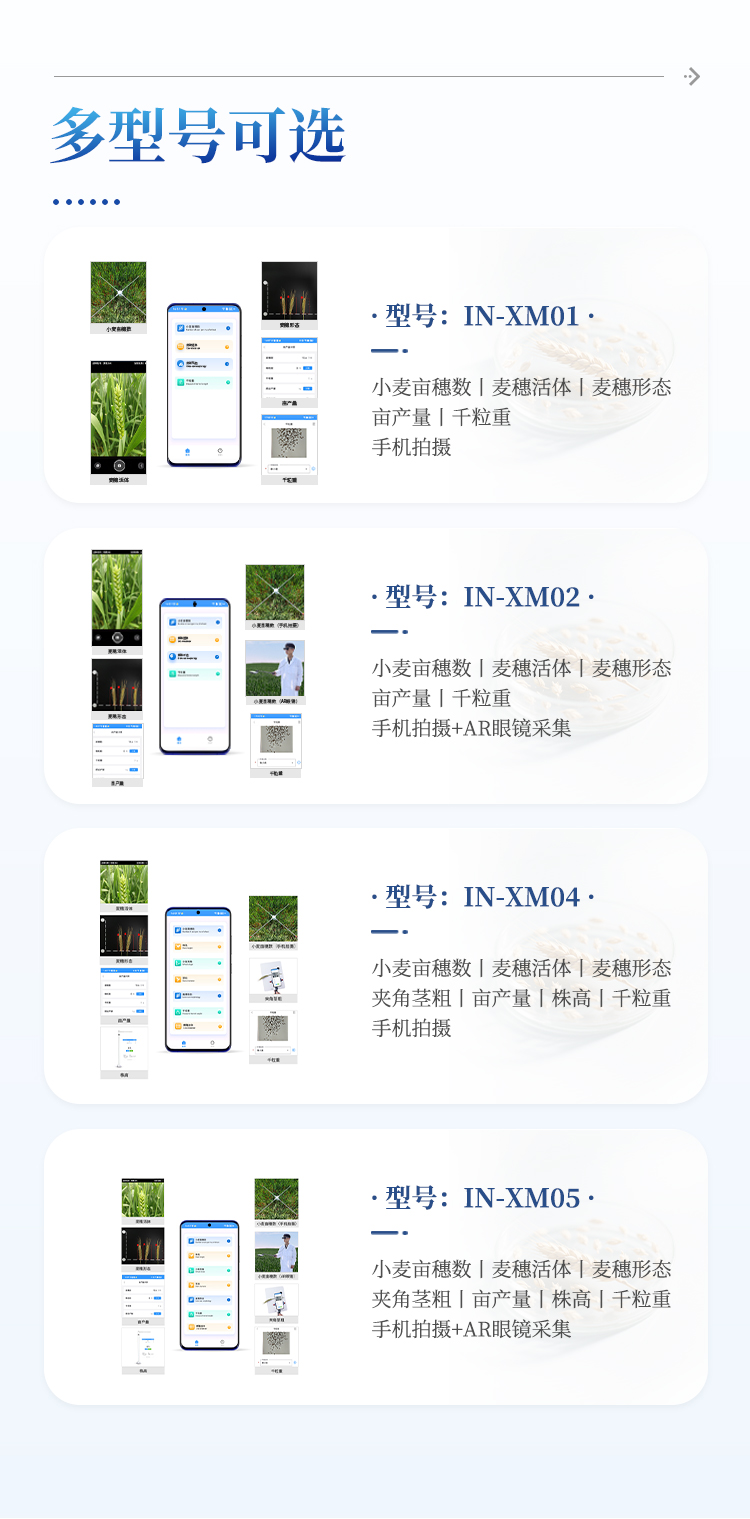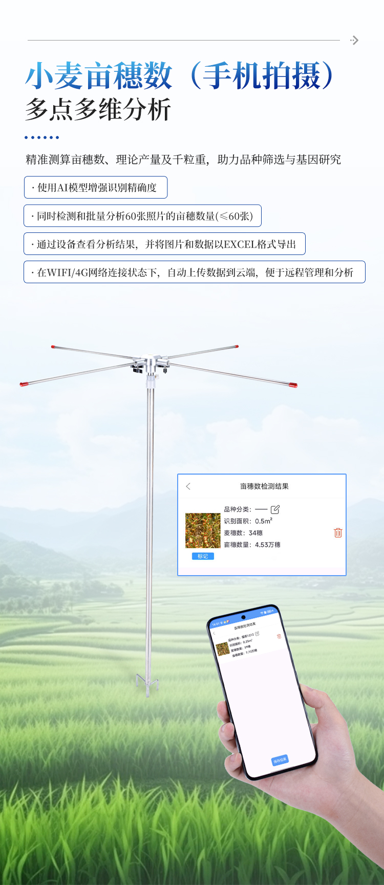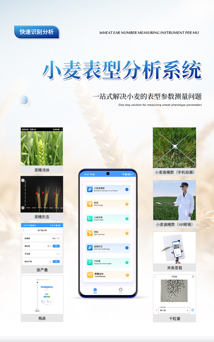 4)麦穗形态测定仪依托手机视觉技术,通过AI图像矫正算法一键获取穗长、小穗数等关键指标。全系统实现田间快速取样、批量分析及数据互联,为育种优化、产量预测和功能基因解析提供智能化解决方案。