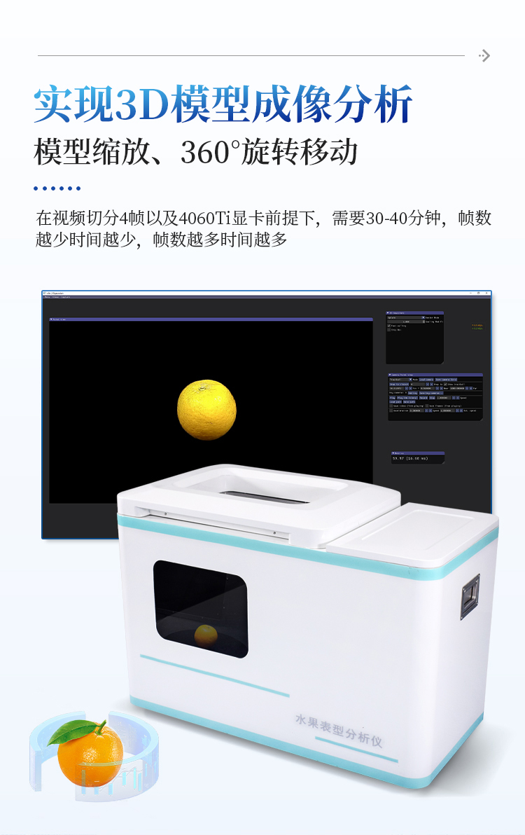 简要描述: 水果表型分析仪是根据图像识别、3D Gaussian Splatting等技术实现模型成像以及分析的。本产品使用了最新的AI成像分析技术,在多视角的条件下对苹果、橘子、梨、西瓜等水果进行扫描,通过生成3D点云图并动态绘制水果表面纹理等操作构建三维的水果模型。同时在进行模型成像过程中也会对水果的形态、纹理、颜色等特征进行分析。