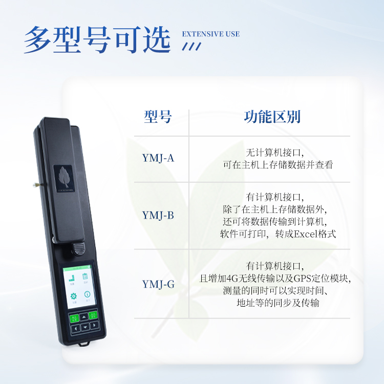 YMJ系列活体叶面积测量仪是新研发的产品。是一种使用方便,可以在野外工作的便携式仪器。它可以精确、快速、无损伤地测量叶片的叶面积及相关参数,也可对采摘的植物叶片及其他片状物体进行面积测量。广泛应用于农业、气象、林业等部分。